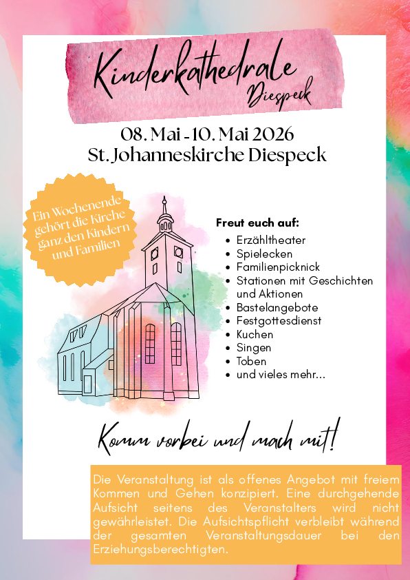Ihr habt Lust, mal eine Kinderkathedrale live zu erleben? Am Muttertags-Wochenende habt ihr in der St. Johanneskirche Diespeck die Gelegenheit dazu. Euch erwarten Erzähltheater, Stationen, Familienpicknick, Abendmahl mit Kindern und ein Familiengottesdienst. Flyer noch hochladen auf der Kinderkirchenseite.